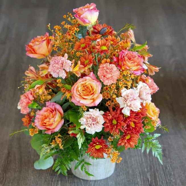 All shades of orange abundantly fill this autumn arrangement of roses, carnations, greenery and daisies. The perfect addition to any crisp, fall day! Flower varieties and container style may vary based on availability.