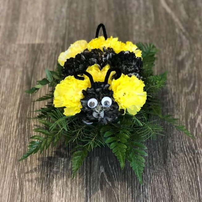 Bright and cheery, this big bee is all the buzz. Brighten someone’s day, send them a just BEEcause bouquet. Made of fresh carnations and mixed greens.