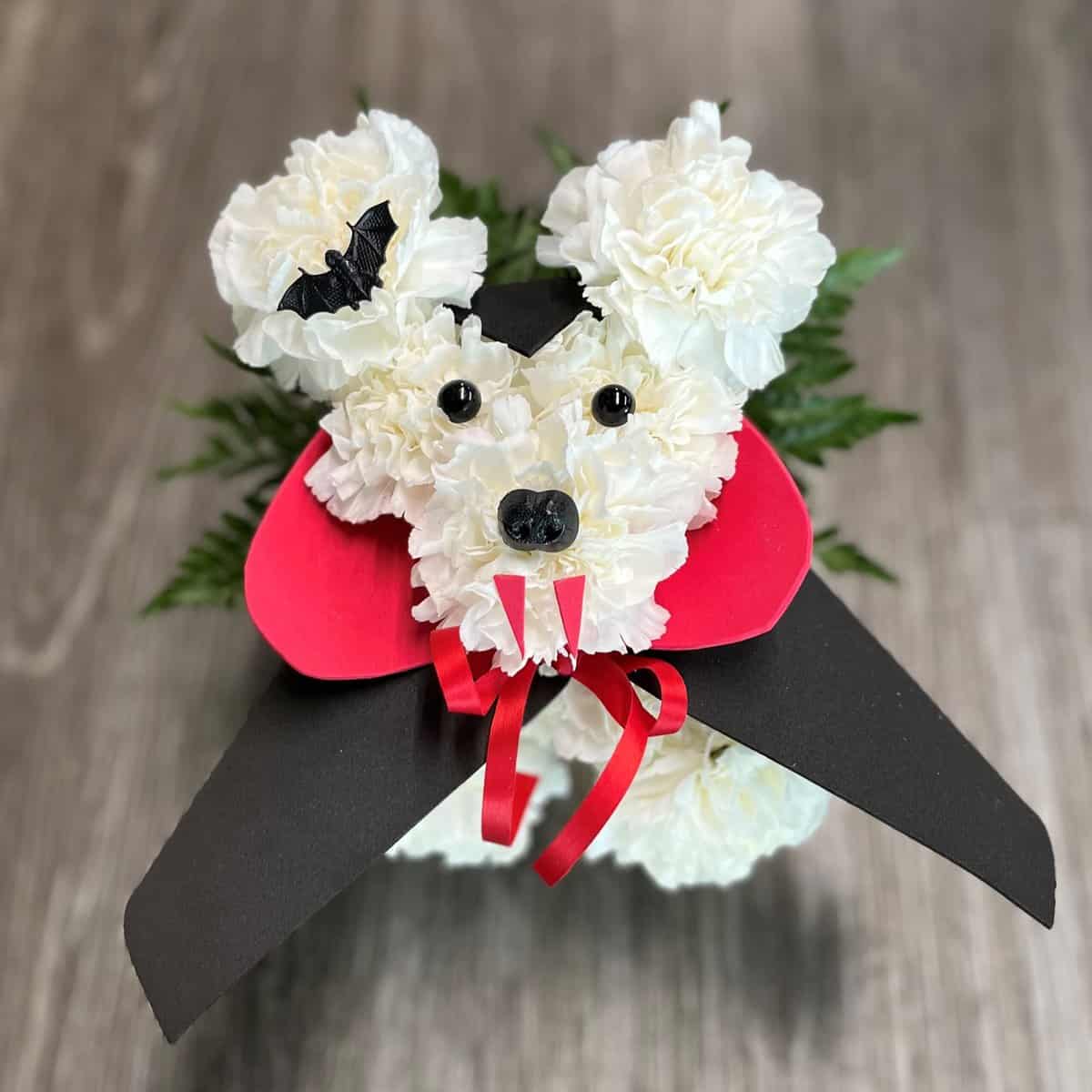 This pup is hand-crafted by our certified florists. Made with fresh carnations and mixed greens it’s perfect for the spooky Halloween season! Local delivery only.