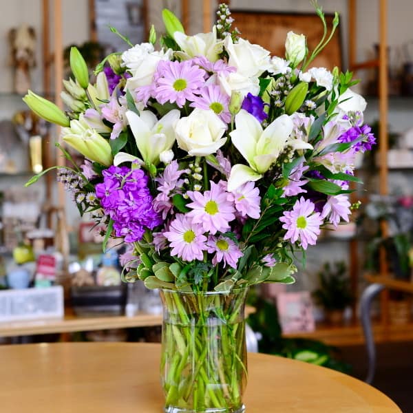 Send your special someone and bountiful flower garden in a vase from Plumeria! This burgeoning bouquet is chocked full of Asiatic lilies, purple stock, lisianthus, assorted chrysanthemums, roses, status, liatris, Monte Casino aster, variegated pittosporum, and mixed greens. The perfect floral arrangement for the flower lover in your life.