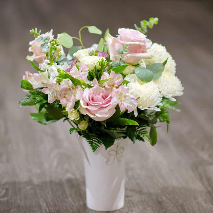 This pastel masterpiece of pink roses and white chrysanthemums is perfect for all occasions. A white vase filled with roses, cushion mums, stock, alstromeria, and eucalyptus. Flowers varieties and container style may vary based on availability.