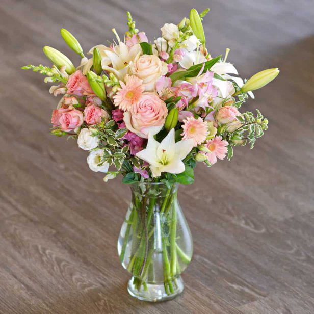 A statement piece in pastel pinks. Gerbera daisies, lilies, pink roses, snapdragons, lisianthus, spray roses, asltromeria and mini pittosporum.