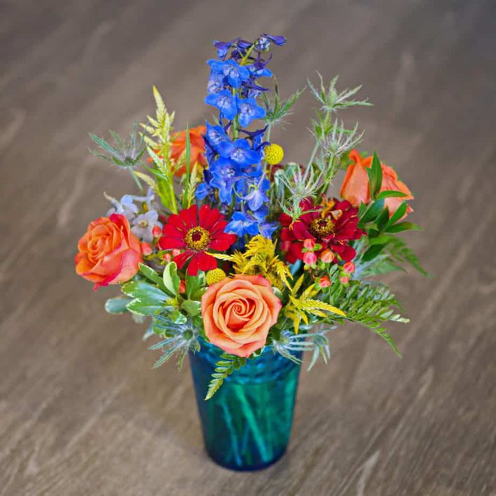 Blue delphinium, bright orange roses and pops of red daisies, in a teal container. A complete bouquet with added texture of thistle, hypericum berries, and solidago. Flower varieties and container style may vary based on availability.