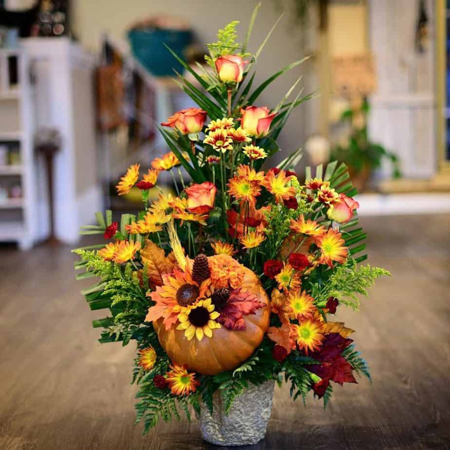 A seasonal mix of bi-colored roses, burgundy mini carnations, solidago, fall daisies, other mixed greens and palm leaves, complimented with fall leaves, a faux pumpkin and pine cones. Flowers and containers may vary.
