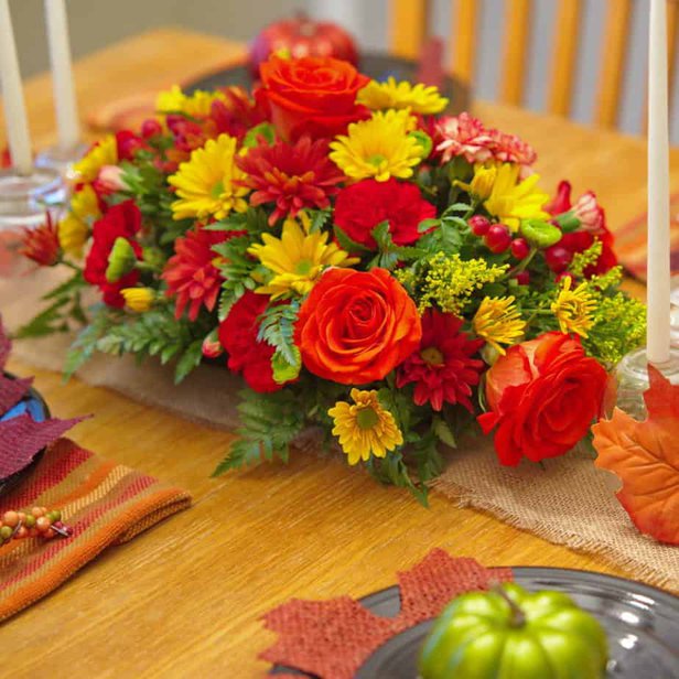 Gather around this beautiful fall centerpiece perfectly crafted with all of the colors of Autumn- lush orange roses, carnations, mums, accented with mixed greens and red hyericum. These flowers will make for a great addition to your gathering table.