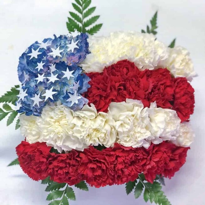 This United States flag made of fresh flowers is a great way to honor a loved one, present or past. The flat container is convenient for placing on a table to celebrate Independence Day or graveside to celebrate a life well lived. Approximately 8″ x 10″ using 24 carnations. Containers may vary.