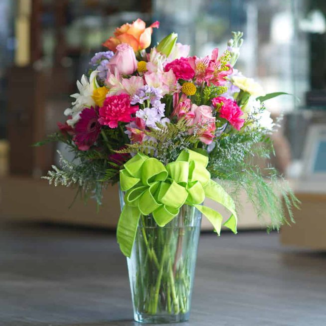 Lush and beautiful, this full garden design will make your heart sing. Full of the freshest flowers in a keepsake vase, perfect for any occasion. A gift of love and care. Container details may vary slightly. Flowers may vary based on seasonal availability.
