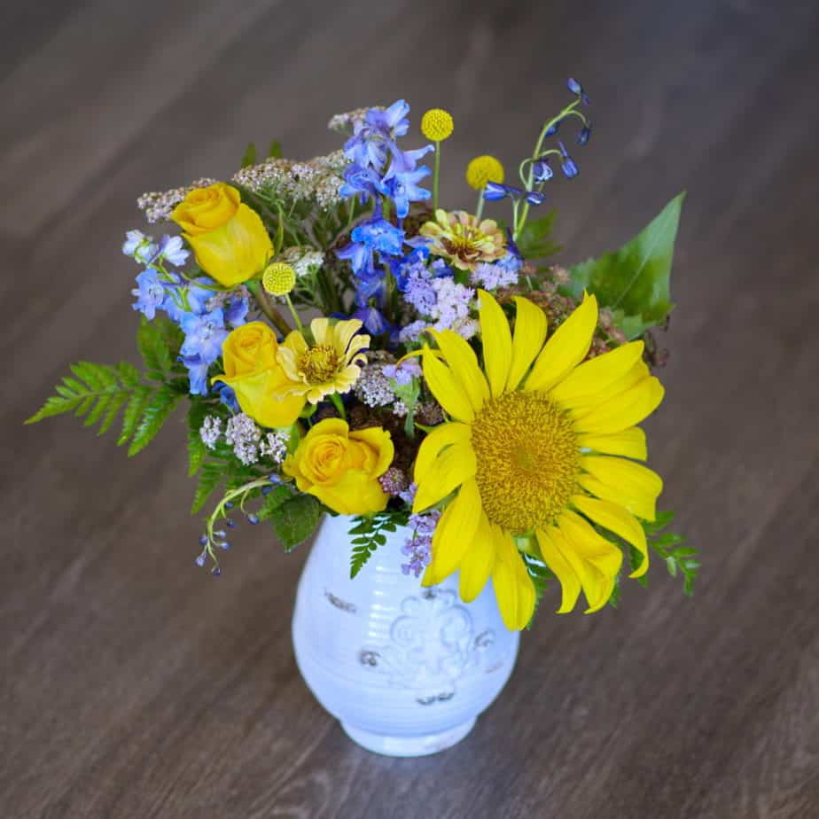 This pitcher of sunshine includes, sunflowers, yellow roses, and blue delphinium. Flowers varieties and container style may vary based on availability.