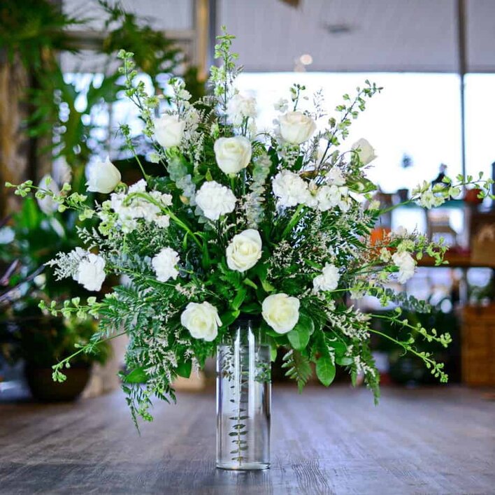 All white flowers create an elegant fan shape on an illusion vase. Roses, eucalyptus, larkspur and mixed green seem to float on thin air. Perfectly balanced, professionally designed, a masterpiece for a special event or a memorable occasion. Flowers varieties and container style may vary based on availability.