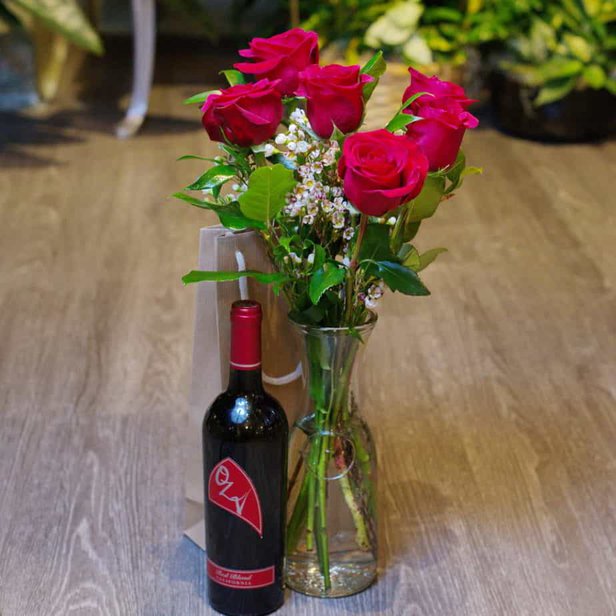 Enjoy a date night from Plumeria! A half dozen roses and a bottle of wine is sure to make for the perfect evening. Flowers varieties and container style may vary based on availability.