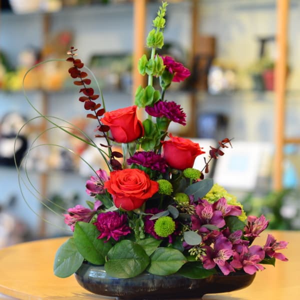 Bells of Ireland are the focus in this artistic display of roses, carnations, alstroemeria, green buttons, bear grass, and mixed greens. Said to give good luck to anyone receiving them, Bells of Ireland are a great gift to wish one good luck and good fortune. Order before 1pm for same day flower delivery!