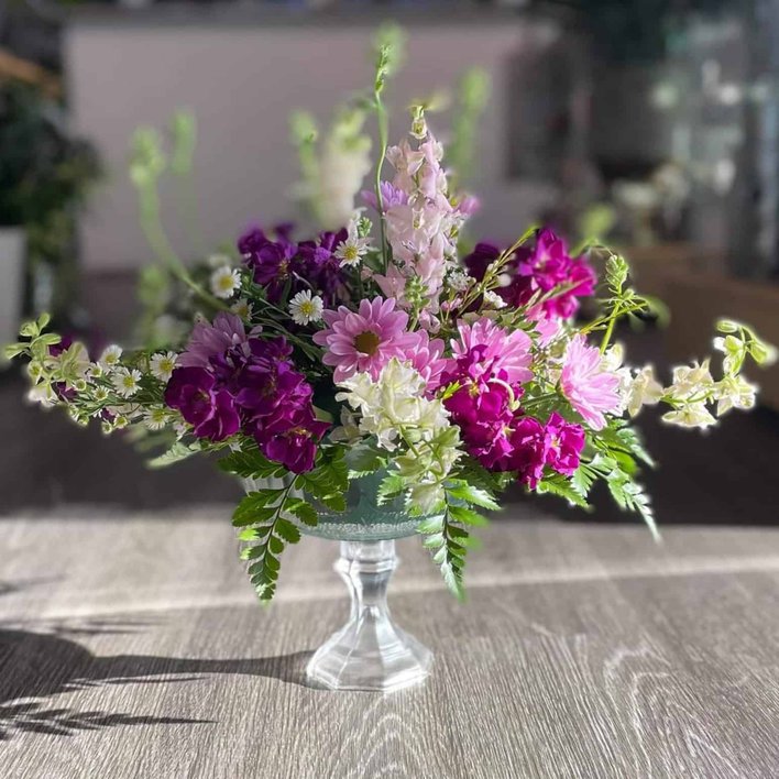 A luxurious display of lavender flowers in a glass compote. Let the sweet smell of fresh flowers fill your room with this beautiful display of lavender blooms.