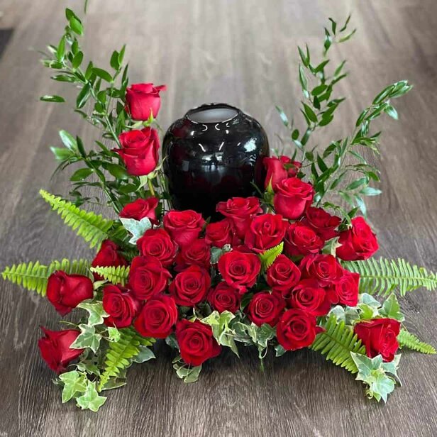 Red is the symbol for love. An abundance of rich, red roses cascade all around your loved ones urn, showing an overflowing amount of love. This radiant flower display will comfort the bereaved in a truly respectful and regal way. Created to fit up to a 9″x 9″ urn Urn not included.