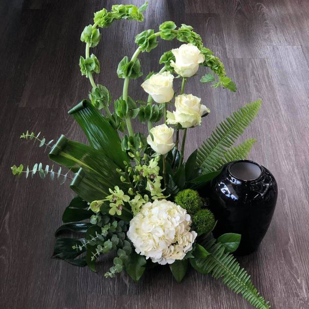 An artistic expression in white and green flowers represent the message of peace, goodness, and light. This beautifully crafted flower display made up of white chrysanthemums, green roses, green hypericum berries, sword fern, ti leaves, and bells of ireland, is a stylized statement piece to honor and celebrate a life well lived. A tall elegant and serene flower arrangement may be placed next to the urn, or stands alone as a floor piece. Approximately 22″H x 20″L Urn not included.
