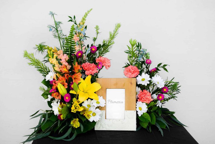 Reflect and Rejoice. Let the brilliant colors of these flowers represent the celebrated memories of your loved one. Beautiful blooms will be hand selected to honor and remember life’s most precious moments. Our tall, elegant flower pieces created with roses, lilies, snapdragons, asters, and delphinium will be in two sections, and may be placed next to an urn, a guest book, or a collection of framed photographs. Picture frames not included.