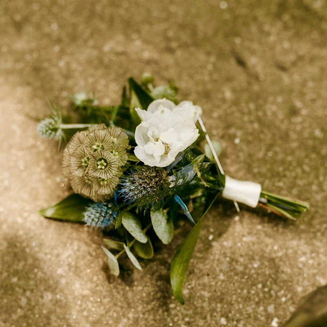 Full of fun textures and flowers, this boutonniere completes any ensemble.