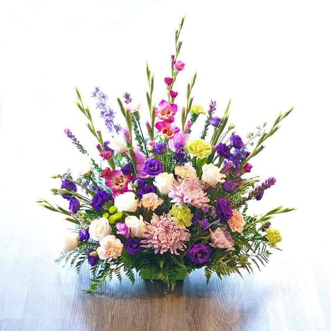 Near, far, wherever we are, our memories go with us. In memory of a loved one or just to touch someone with love through flowers. Let us create this stunning array of fresh flowers, in peach, purple and green. Specific flowers and colors may vary based on seasonal availability.