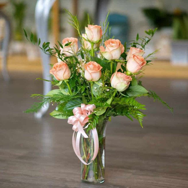 Peach roses perfectly, hand placed in a clear glass vase. Peach roses, ruscus, leather leaf and a pretty pink bow, in a clear vase, perfect for your special occasion. Flowers varieties and container style may vary based on availability.
