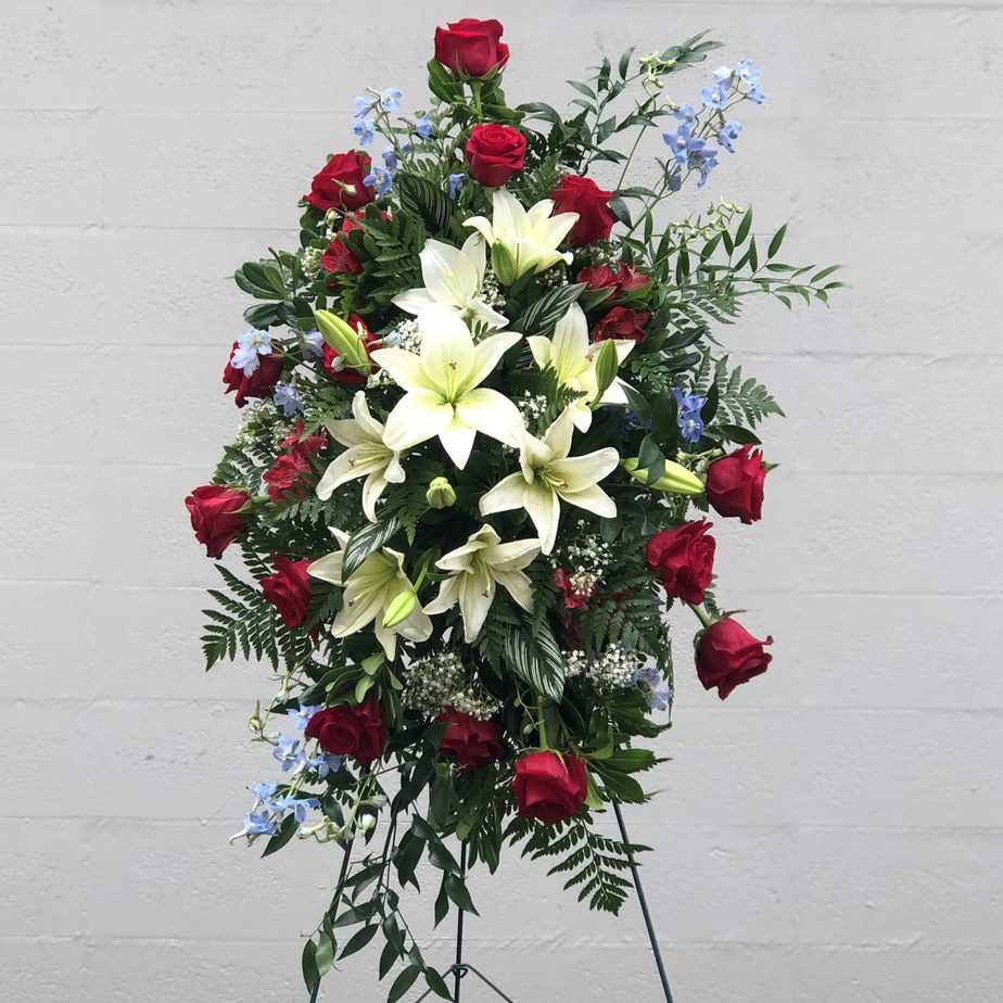 An elegant, standing display of all red, white, and blue flowers, representing loving memories. Remember your loved ones with flowers that symbolize love, and honor. Our expert flower designers will hand craft a beautiful, meaningful arrangement created with an array of red, white, and blue flowers. Flowers shown are standard carnations, mini carnations, roses, lilies, delphinium, with lush greens. Wire easel included. Approximately 44″ H