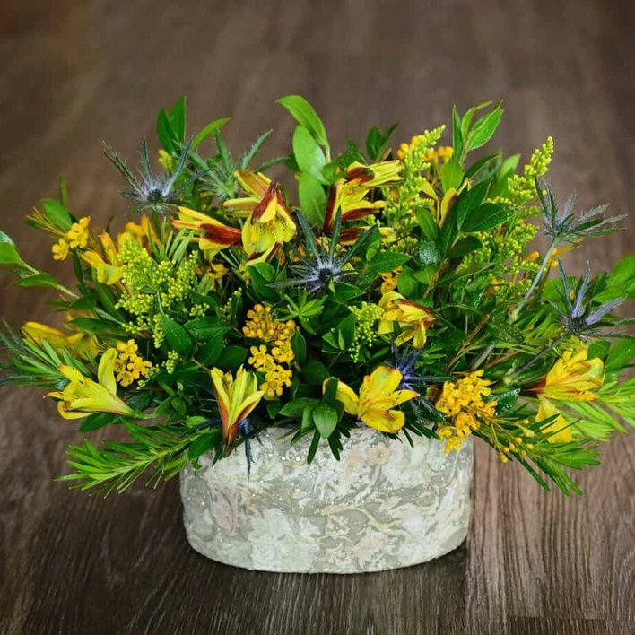 Beautifully arranged in a decorative stone flower pot, Naturally Radiant features a mixture of lush greens, pops of yellow solidago, alstroemeria, thistle and accented with a hint of wax flower.