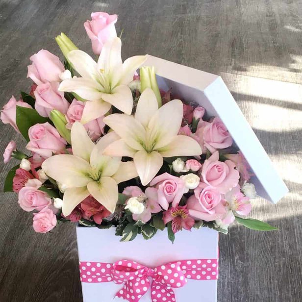 Stunning white lilies, pink roses, miniature dianthus,and peruvian lilies, make up the beautiful box of blooms! A reusable, recyclable, white hat box is used to create this unique presentation. A Big and showy gift for all occasions. Think outside the vase. Box is approximately 8″ square.