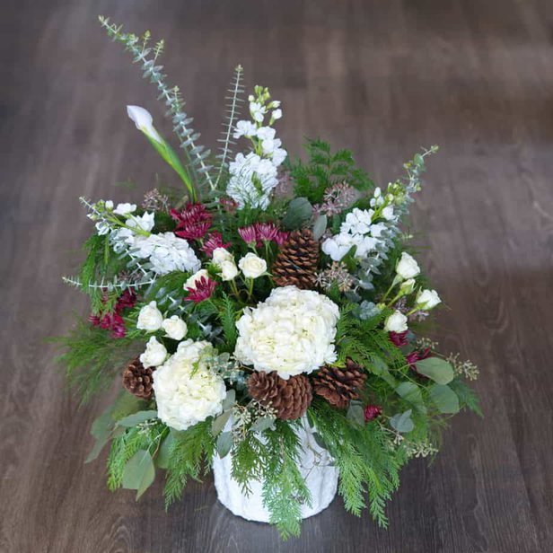 Enjoy the aesthetic beauty and aromatic nature of this beautiful arrangement. Nothing invigorates the senses quite like the smell of cedar greenery on a snowy day.