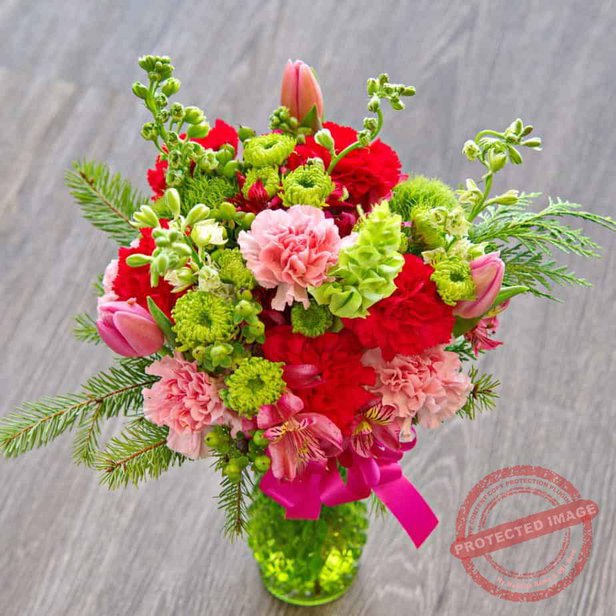 A harmony of colors are captured in this blissfully bright arrangement. A soft and sophisticated mix of pinks and reds, complimented with fresh greens and hand gathered by our expert designers in a vintage green vase. This beautiful gift is sure to bring pure bliss. Flower and container may vary.