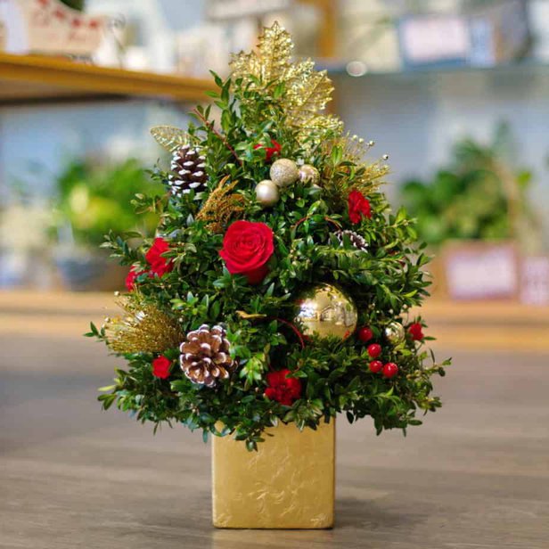A hand crafted pine tree for your table top made with glitter and gold. Fresh pine and flowers will surely make your holidays sparkle. Individual pine sprigs create this miniature evergreen tree decorated with fresh flowers and ornaments. A perfect gift and a perfect size for your table. Flowers and container may vary. A variety of colors are available upon request. This is a fresh cut flower and pine arrangement, not a potted pine tree. Approximately 12″ tall’