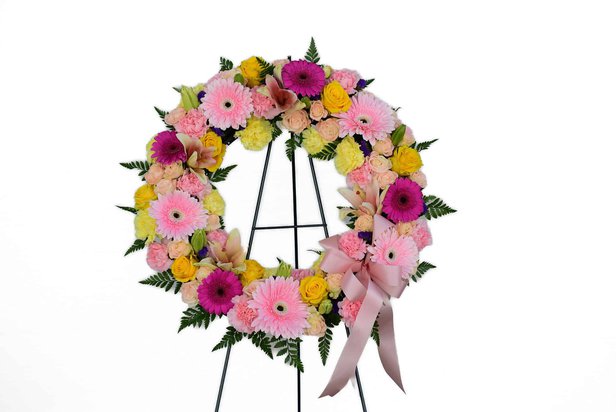 No beginning and no end, a wreath represents everlasting life. Let the symbolism of this wreath adorned with peach and orange hues honor the life of your loved one. Pink gerbera daisies, peach roses, orange carnations, pink lilies and a variety of mixed flowers will be expertly designed to create a soft and stunning flower display. Standing wreath approximately 24″ Wire easel included