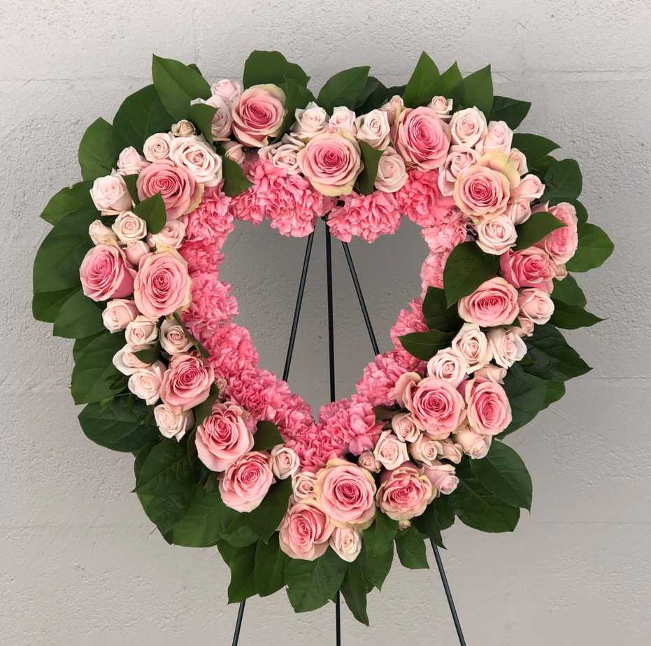 A heart shaped wreath, created with beautiful, pink flowers represents love and cherished memories for a celebration of life. Honor your loved one with this flower creation of pink roses, miniature roses, carnations, variegated, lush greens. Heart shape approximately 23″ Wire easel included Other colors available upon request.