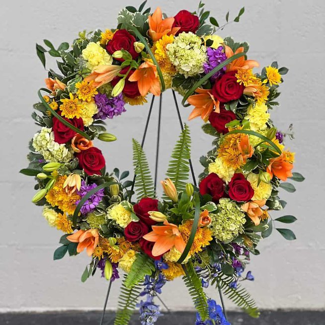 Inspired by a golden sunset shining on flowers in a field, this bountiful wreath is full of multiple textures and rich colors. A beautiful display for a celebration of life. Our expert designers will use roses, chrysanthemums, daisies, lisianthus, dianthus, lilies, limonium, and delphinium to create this radiant reflection of life. Wreath is approximately 22″ Wire easel included carnations, roses, lilies, delphinium, mixed greens