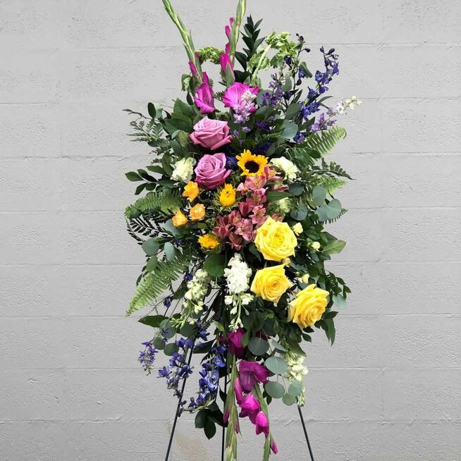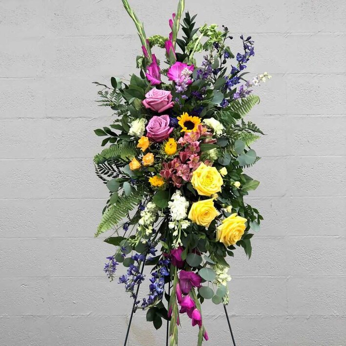 An elegant, standing display of colorful flowers, representing the wonderful combination of celebration of a life of love and fond memories. Our expert flower designers will create a beautiful, meaningful arrangement made with roses, sunflowers, delphinium, snapdragons, dianthus, and lush greens. Wire easel included. Approximately 44″ H