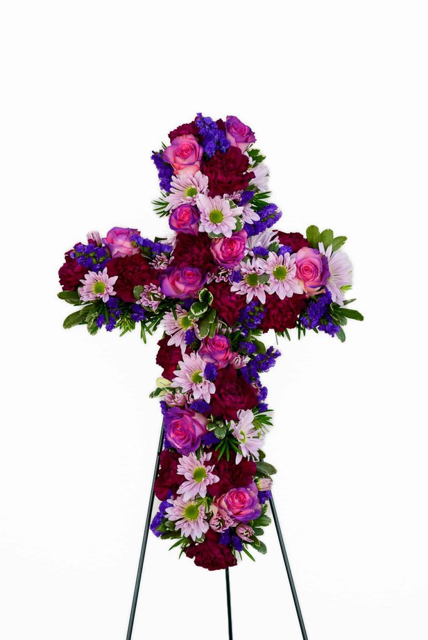 An beautiful flower cross is carefully crafted with the freshest flowers to represent hope and peace. Cherish your loved ones memories with this splendid sympathy piece. Divine purple flowers of roses, carnations, chrysanthemums, Peruvian lilies, monte casino, mini dianthus and pitt0sporum combined and created to perfection. A lovely tribute for a life well lived. Cross approximately 22″ Wire easel included