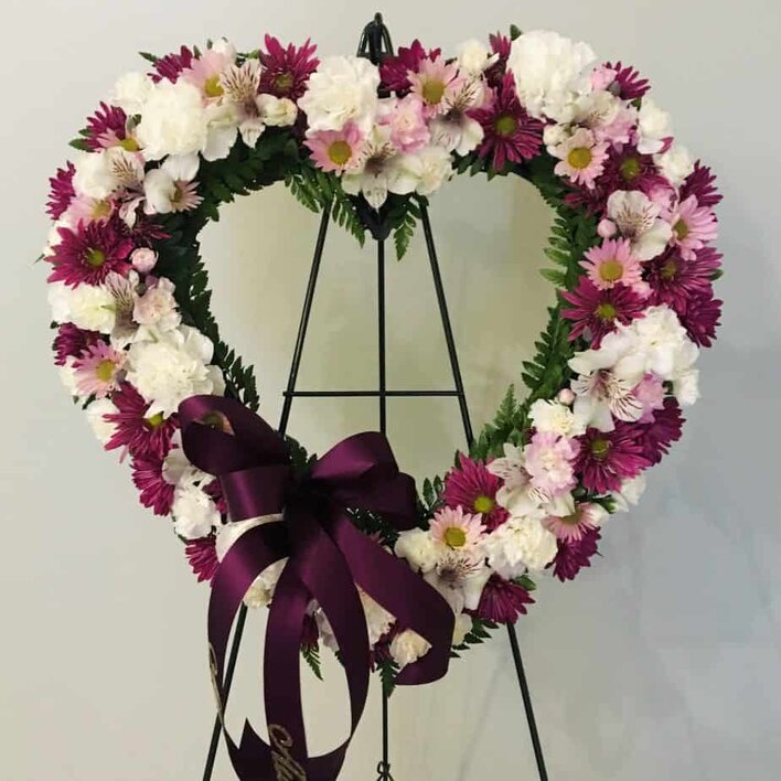 A heart shaped wreath, created with beautiful flowers represents love and cherished memories for a celebration of life. Honor your loved one with this flower creation of angelic, white roses, white carnations, blue tinted carnations, adorned with ivy and a coordinating purple ribbon. Heart shape approximately 23″ Wire easel included