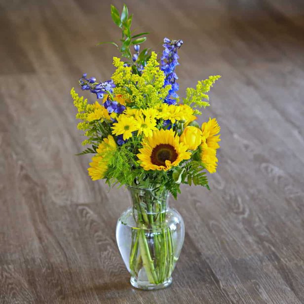 Brighten anyone’s day with this custom bouquet filled with bright yellow sunflowers and daisies reminiscent of a sunny day, accented with vibrant blue delphinium and mixed greens. Flowers varieties and container style may vary based on availability.