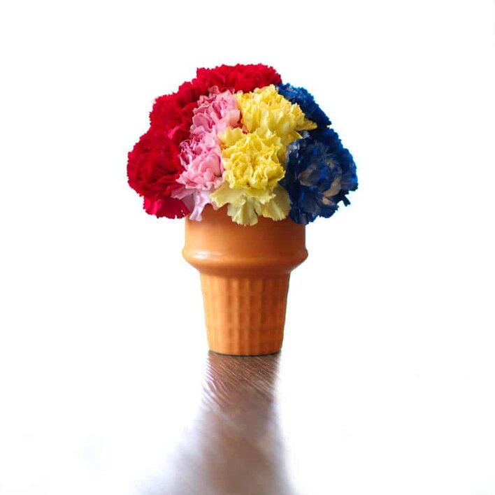 This nostalgic gift will make your mouth water and delight your nose. Bright carnations fill a ceramic ice cream cone to create a long lasting sweet treat.