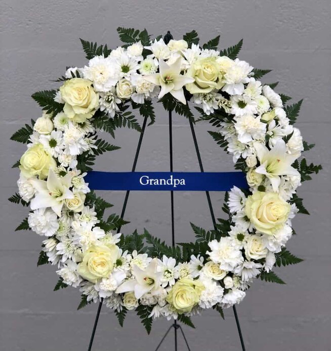 A beautiful memorial wreath filled with all white blooms and greenery, displayed on an a wire easel. This wreath is adorned with flawless assorted lilies, roses, carnations, mums, and daisies. This heartfelt arrangement is a loving tribute of fresh flowers for your loved one.
