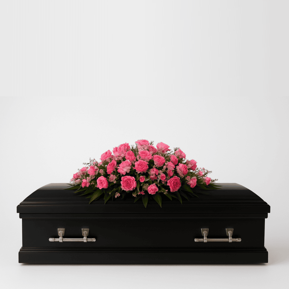 Pay tribute to your loved one with the Brilliant Blush full casket spray from Plumeria Botanical Boutique. The beautiful shades of pink roses, spray roses, snap dragons, carnations and lush mixed greens will inspire fond memories of friends, family, and loved ones. This breathtaking floral design is a fitting honor for a life well lived.