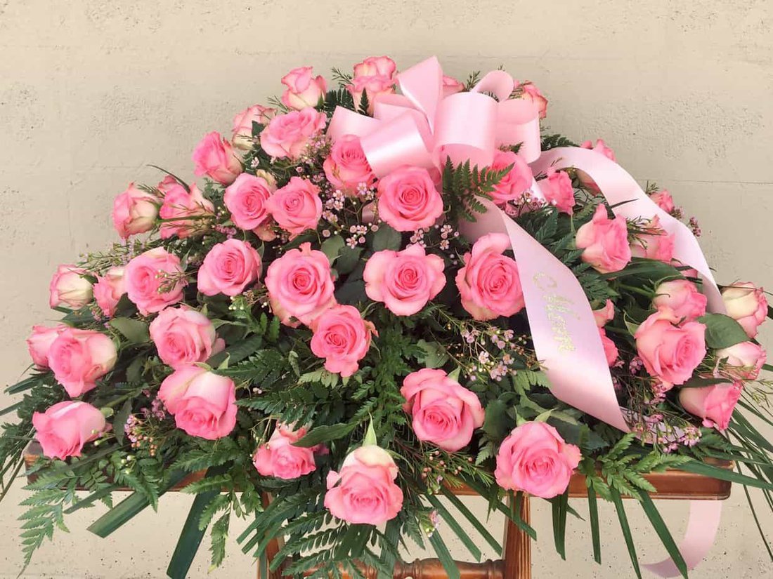 The Heavenly Pink Rose Casket Spray is a wonderful way to honor and commemorate a life well lived, full of love and beauty. This piece is elegantly designed with an abundance of pink roses and lush mixed greens. An in-house printed bow can be added to customize this piece for your loved one.