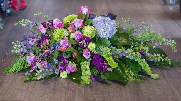 A tribute arrangement made to honor your loved one and a life well lived. This beautiful display of flowers is sure to inspire conversations of wonderful memories among family and friends. Crafted with vibrant shades of purple blooms, hydrangeas, delphinium, and lush mixed greens; Add a custom printed ribbon to complete this memorial piece.