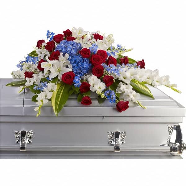 Honor your loved one with the Patriotic Peace casket spray from Plumeria Botanical Boutique. This casket floral tribute exemplifies love of country, displaying a message of strength, respect, and freedom. The vibrant red, white, and blue flowers are a powerful reminder of a life well lived.