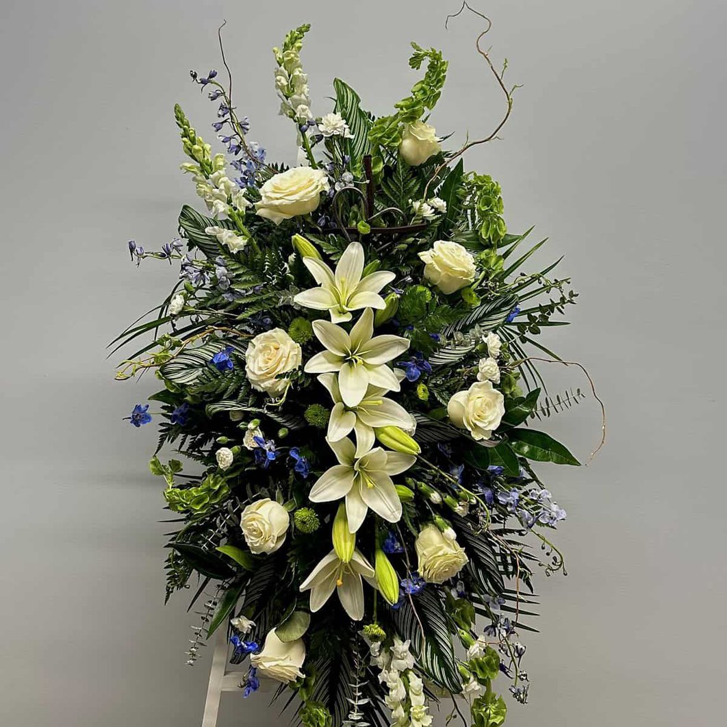 A standing spray beautifully displayed to honor your loved ones. With bright white roses, lilies, mini carnations, eucalyptus along with other lush greens and a pop of beautifully blue delphinium.