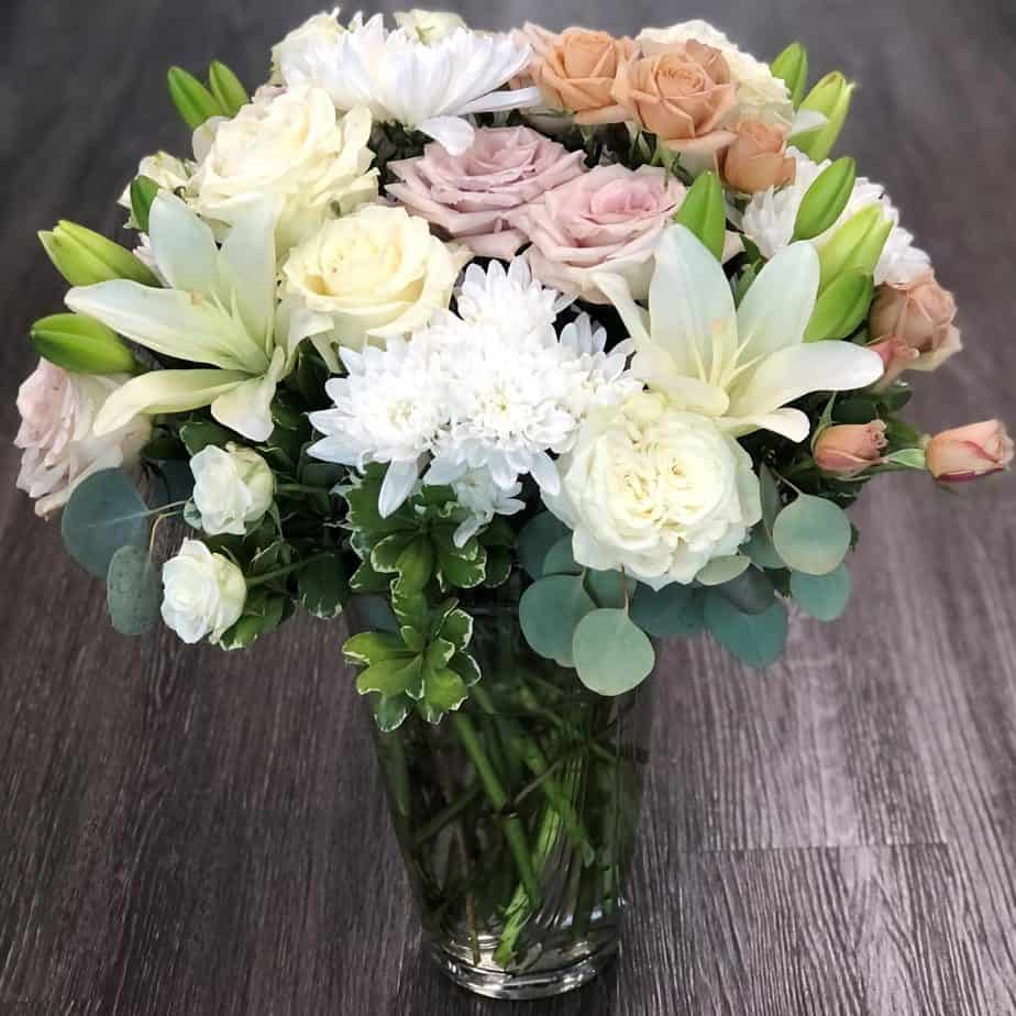 Send your deepest sympathies with this glass vase arrangement, filled with pastel roses, mini roses, chrysanthemums, lilies, seeded eucalyptus, and mixed greens. The soft hues and textures of this gift will send a comforting message to console loved ones and celebrate a beautiful life.