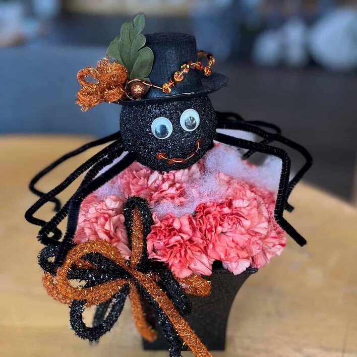A festive table topper of fresh carnations and an adorable spider. The perfect size for a hostess gift or cocktail table.