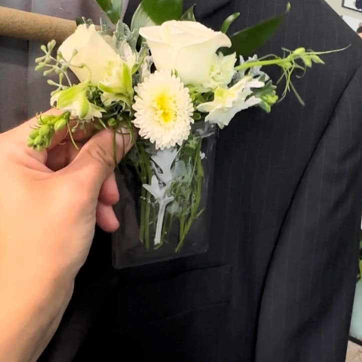 Pocket Boutonnieres provide the perfect, finishing touch to a formal look. The flowers are placed in a clear sleeve that simply slips into the lapel pocket. No pins, no fuss, no crooked flowers! Picture perfect every time!