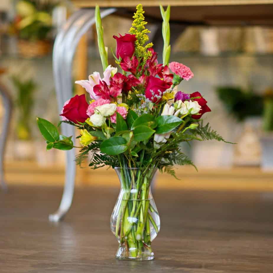 This glass vase holds beautiful, fresh flowers and a message from the heart. Each flower is hand placed and includes: gladiolus, roses, lilies, alstromeria, and garden roses. A lush display of beauty, representing the sentiment of heartfelt affection.