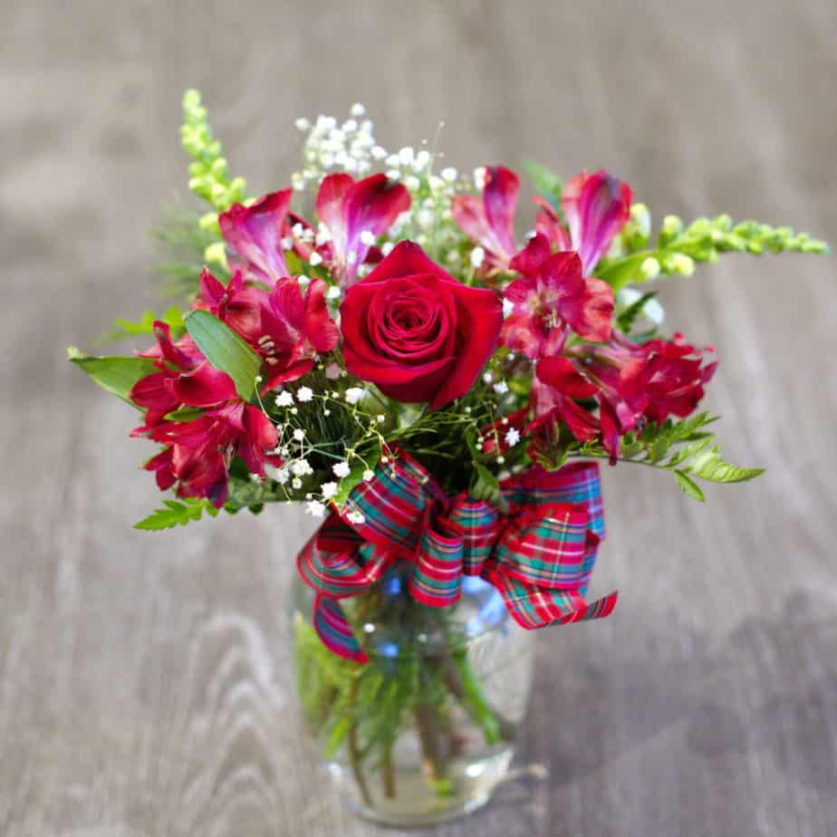 A simple yet elegant clear glass vase filled with colors of the Christmas season. Fresh roses, Peruvian lilies, stock, baby’s breath and mixed greens, accented with a seasonal bow.