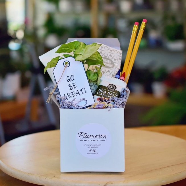 The perfect teacher gift! Compete with all of the essentials- tissue, #2 pencils, crayons, chocolate and a green plant to brighten up their space. Send them back to school with a smile this year 🙂