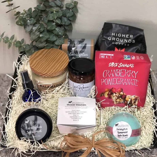 From surgery to sniffles and everything in between, show you care with a custom created gift basket by Plumeria. We pack all the best goodies in this box- Coffee, honey, yummy snacks, and everything you could need for relaxation and healing. We include a fresh bunch of eucalyptus, a Kalamazoo Candle, a delightful, locally crafted perfume, Milk & Quakers bath bomb, soap and body butter.