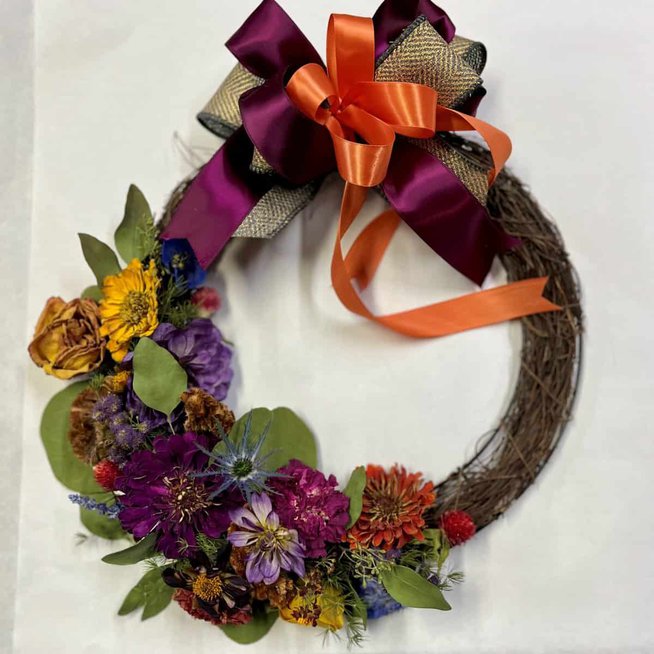 12″ grapevine wreath adorned with colorful, dried, and preserved flowers. Brightly colored Zinnias, Daisies, Thistle, Coxcomb, Dahlias, and mixed greenery are carefully hand placed around a natural grapevine wreath on a wire form.